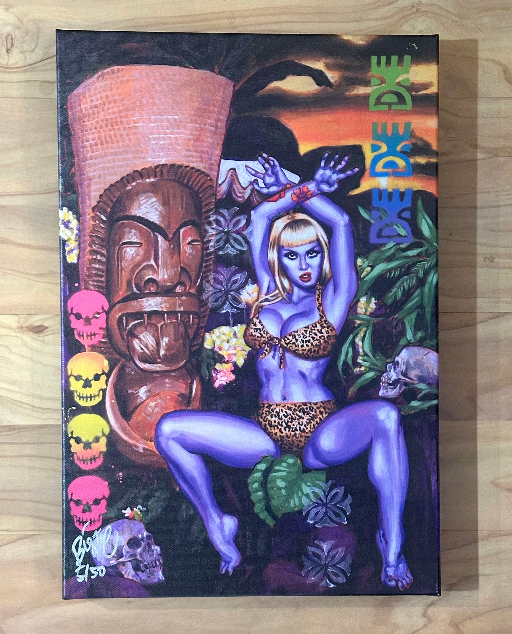 Concrete Blonde is a heart-felt homage to the heavenly queen of punk Pinup models, Masuimi Max, my painting inspired by a photo by Susana of Vestige Photography, and and a famous tiki carved by famed carver Mulan Guanko, that was created for Sams Seafood in Sunset Beach, California. This is an archival quality hand-signed print, created from my original acrylic painting, which is has sold, and is part of my Tiki Punk art series. This is an archival quality hand-signed and numbered canvas giclee print, from editions of 50 prints, created from my original acrylic painting. The Medium, Large and XL sizes are signed and numbered, limited editions.