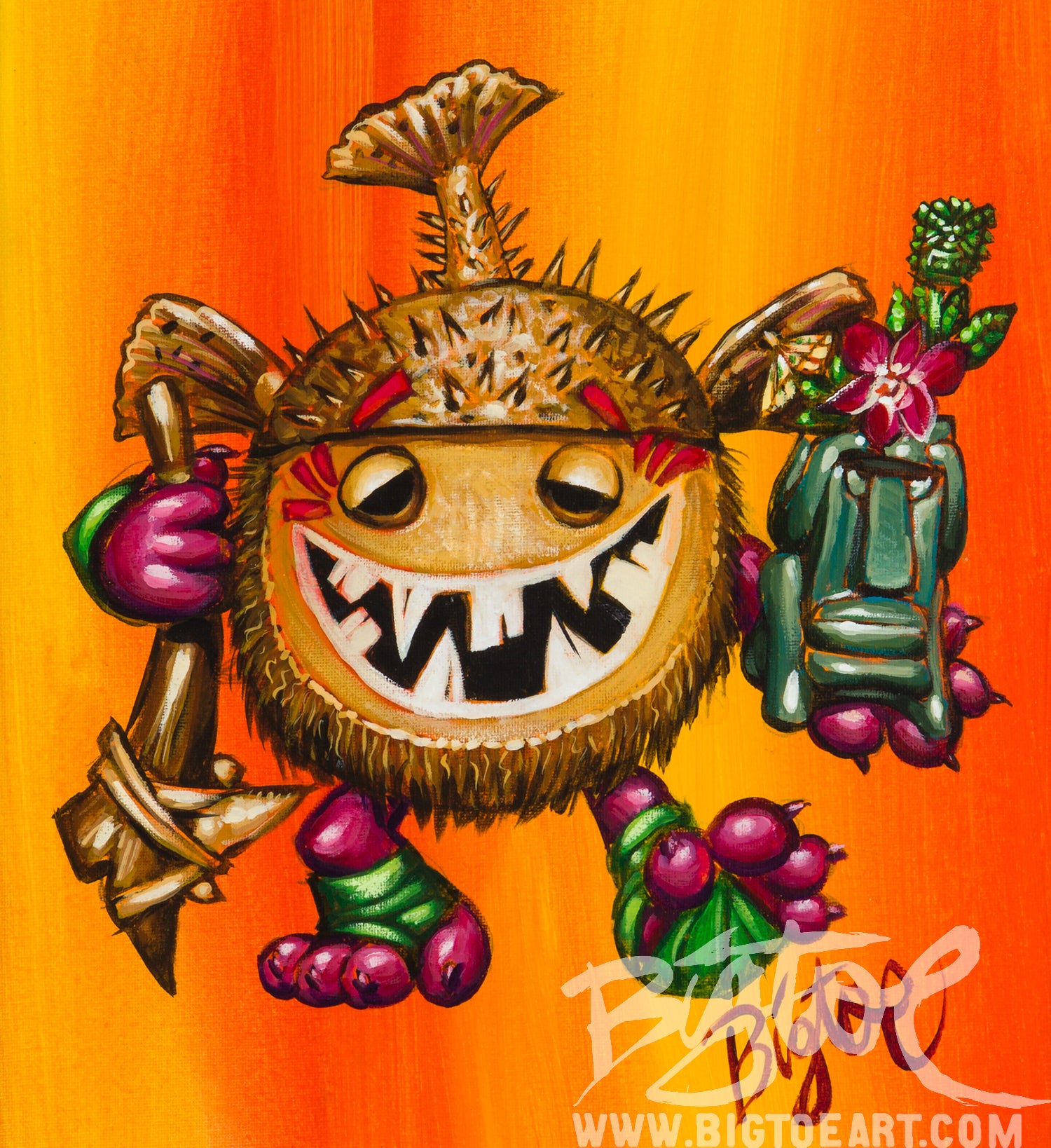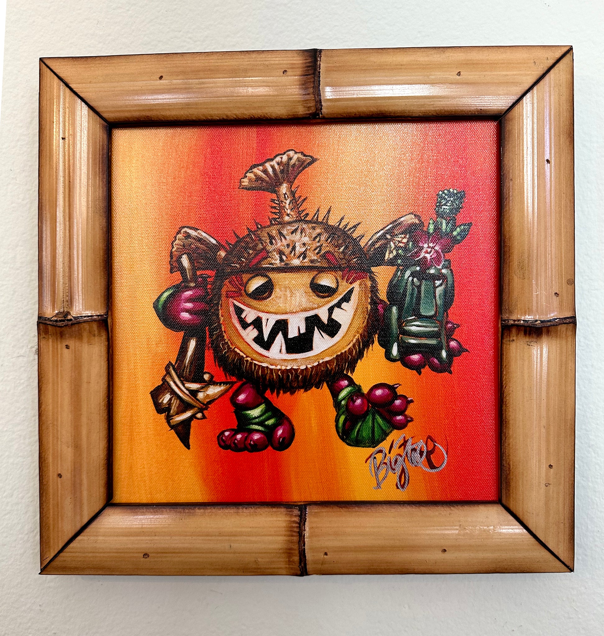 This is a cartoony parody of everyones favorite Polynesian pirates. After a long day of pillaging in tropical waters, our little rascal has earned a cocktail in a Trader Vic's "Suffering Bastard" tiki mug. This is an archival quality canvas print, hand-signed and presented in a custom bamboo and wood frame..
