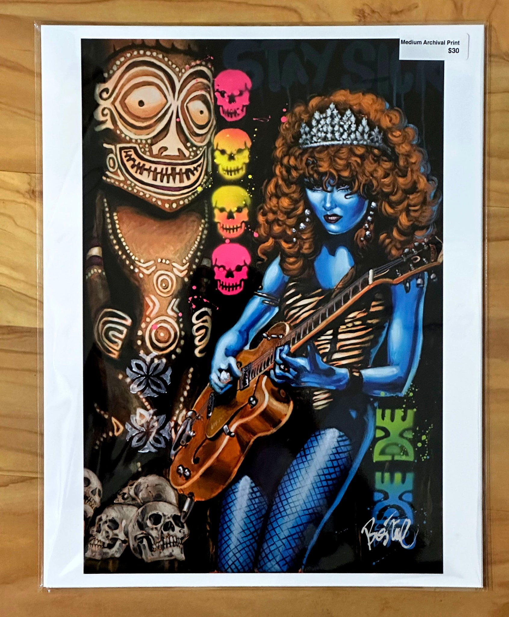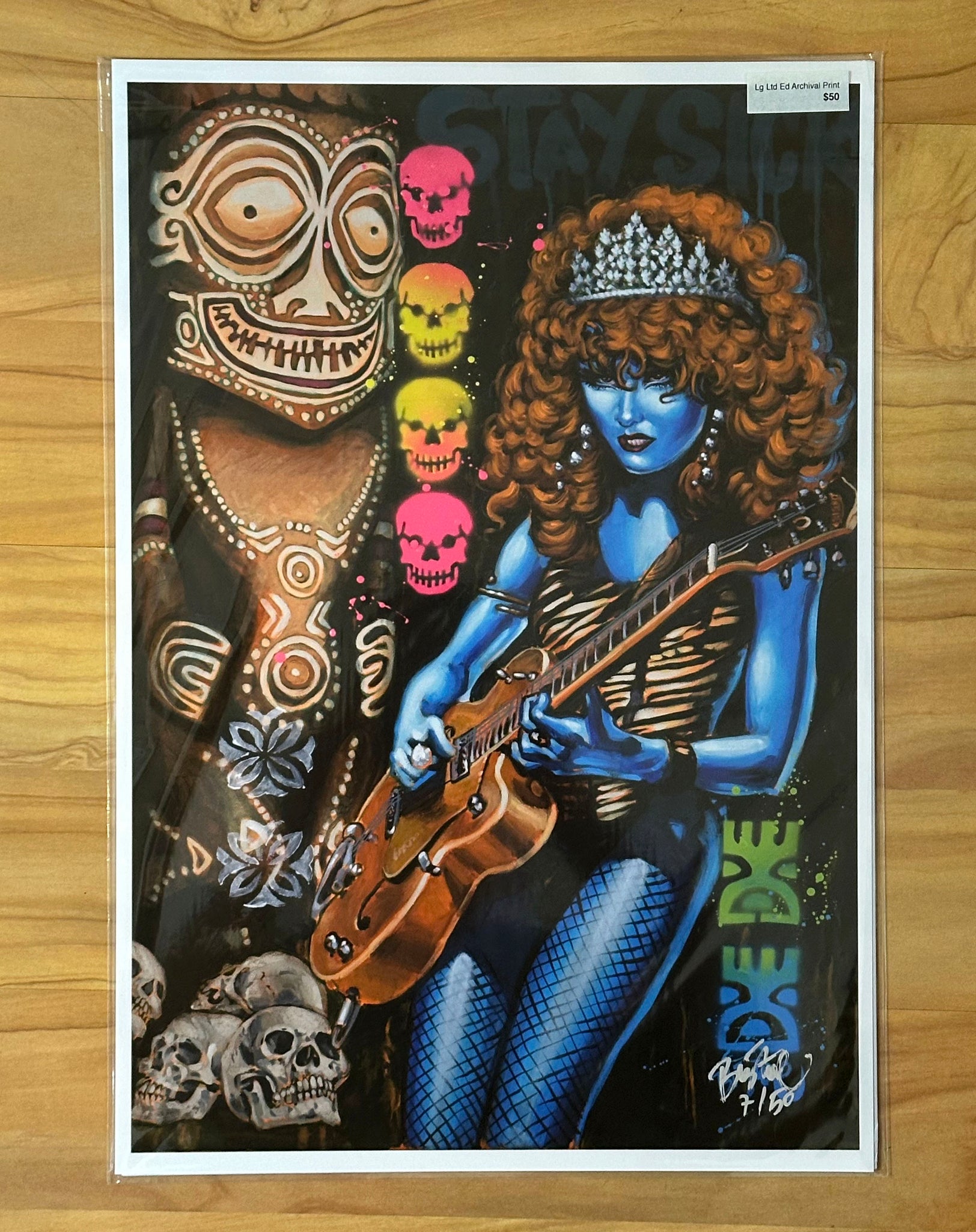 Poison Paradise is a heart-felt homage to the queen of punk rock, Poison Ivy Rorschach, of the seminal psychobilly rock band, The Cramps, and a tiki carved by the immortal Leroy Schmaltz of the legendary Oceanic Arts, formerly of Whittier, California. This is an archival quality hand-signed print, created from my original acrylic painting, which is has sold, and is part of my Tiki Punk art series. The Large and XL sizes are numbered, limited editions.