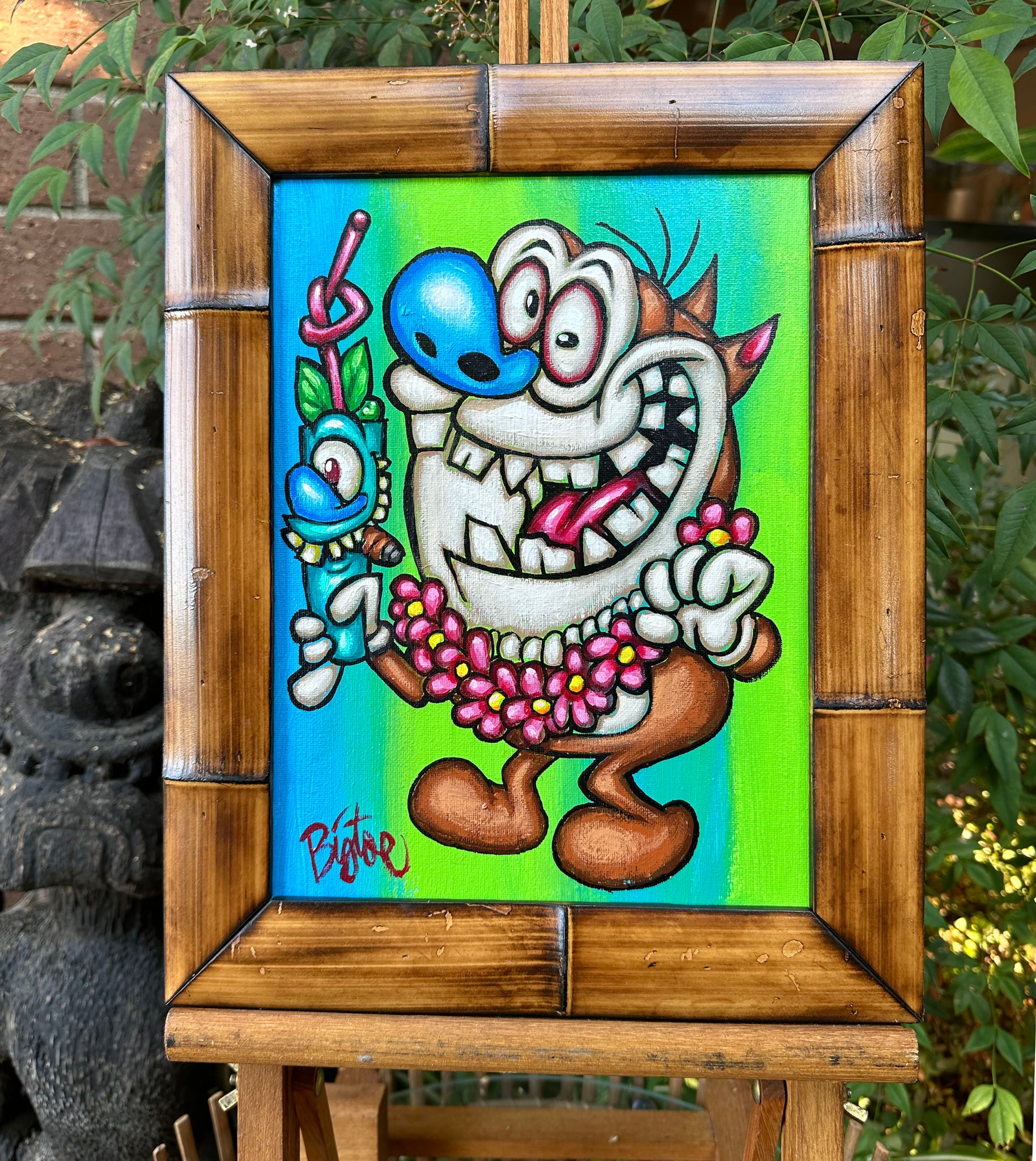 "Tiki Stimpy", acrylic painting. My Painting is a fanciful homage to a favorite TV show, the Red & Simpy Show. Stimpy is all ready for a tiki party. Bonus points if you recognized his tiki mug is based on one of my favorite guest characters from the show: The Bellybutton Link Goblin. This is an original acrylic painting created in 2024.
